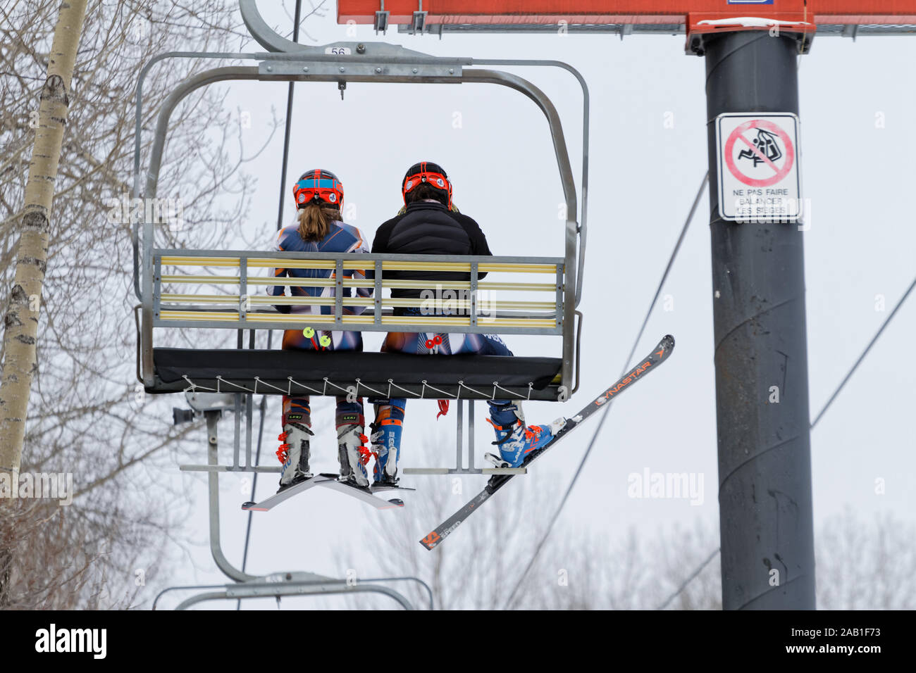Quebec Canada Two Skiers Sitting In A Chair Lift At The Val Saint Come Ski Resort Stock Photo Alamy
